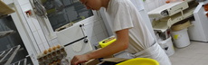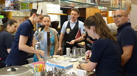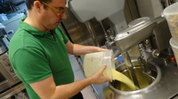 Inzwischen ist es 13 Uhr. Sechs Stunden sind vergangen, seit Sven den ersten Sack Malz in die Sudpfanne gekippt hat. Nun ist es fast vollbracht. Versprochen. Aber das Wichtigste fehlt noch: Der Alkohol. „Und den wollen wir doch alle.“ Deshalb füllt Sven die Würze in einen Gärbottich und führt Hefe zu.