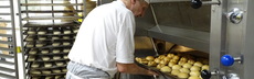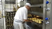 Sebastians Vater zieht sekundenschnell einzeln die großen schwarzen Bleche mit goldbraun gefärbten Brötchen und Hörnchen aus dem Ofen. Voller Körpereinsatz. „Deshalb sieht man in den Fitnessstudios so wenige Bäcker“, sagt Ralf Groß. Pausen gibt es kaum in der Backstube.