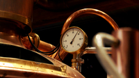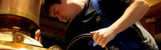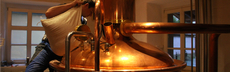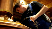 Sven schiebt den Deckel des rechten Kupferbottichs zu, den man im Brauer-Jargon Sudpfanne nennt. Das war’s mit dem Einmaischen, dem ersten Schritt des Brauens. Bei diesem mischt der Brauer Wasser mit Malz. Das Ergebnis nennt sich Maische.