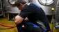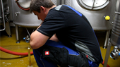 Abgetragene Latzhose, Zweitagebart, pragmatische Kurzhaarfrisur. Er produziert das, was Kulmbach einst berühmt gemacht hat: Bier.